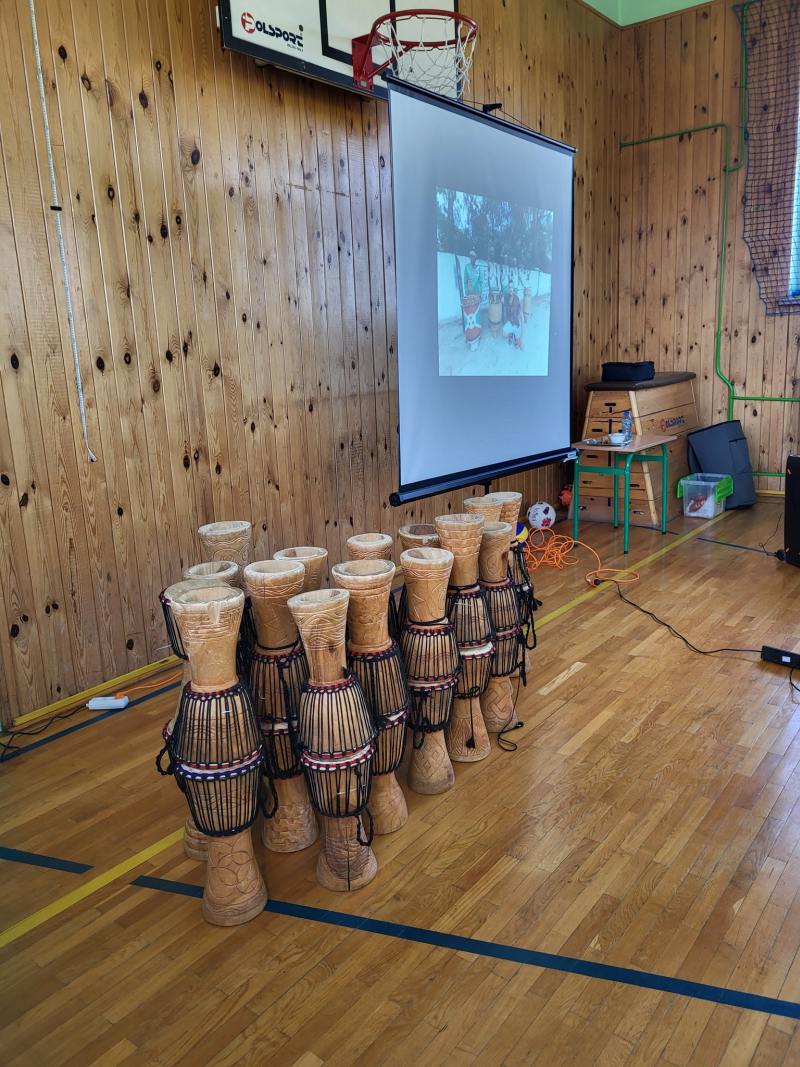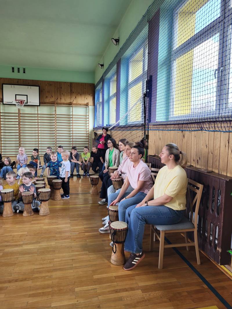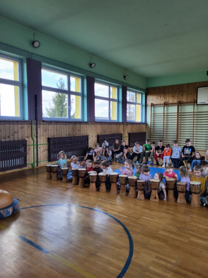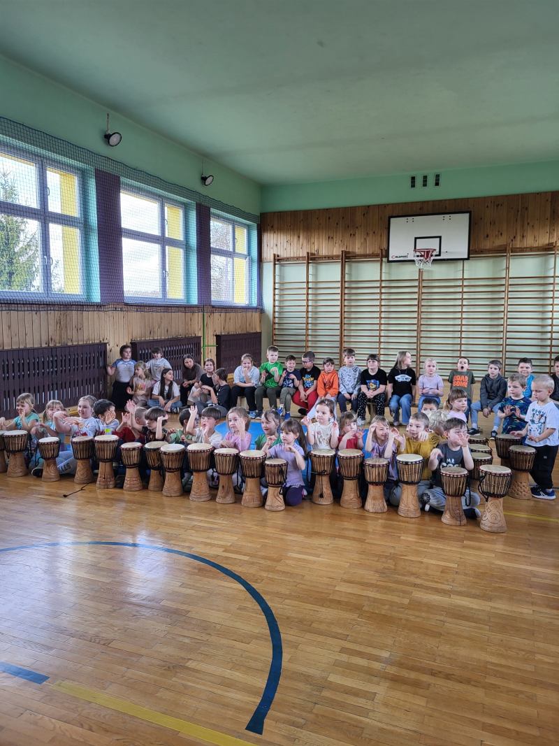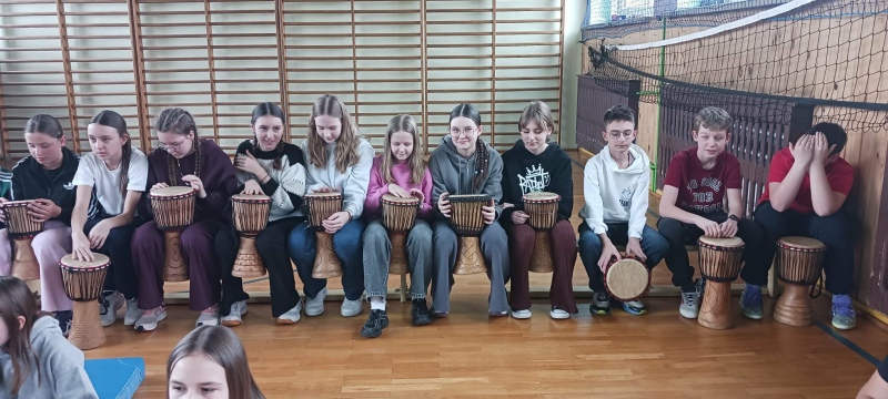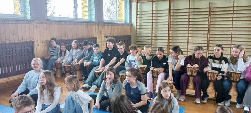 Największą atrakcją były jednak warsztaty muzyczne dla każdej klasy. W ich trakcie każdy uczeń miał okazję spróbować swoich sił na bębnie djembe i poczuć prawdziwy afrykański rytm.