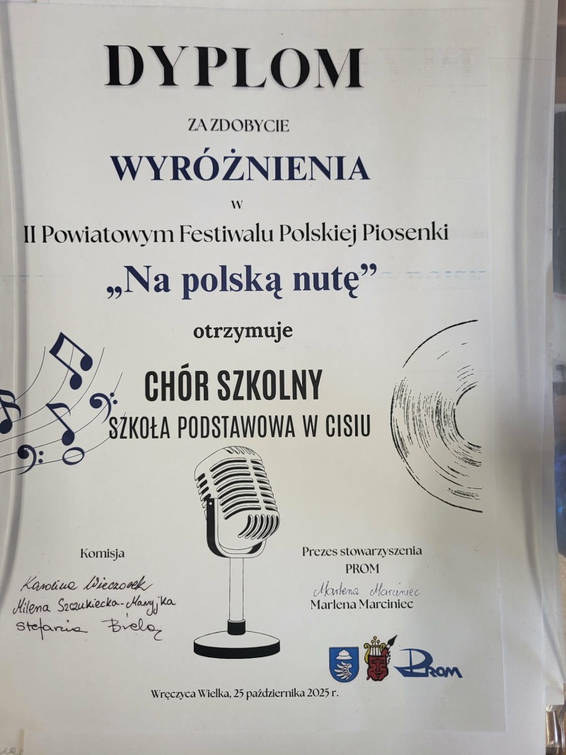 Nasz szkolny chór pod kierunkiem pani Eweliny Dawczyk zdobył wyróżnienie podczas II Powiatowego Festiwalu Polskiej Piosenki "Na Polską nutę" w Gminnym Ośrodku Kultury we Wręczycy Wielkiej. Warto podkreślić, że konkurencja była bardzo duża.